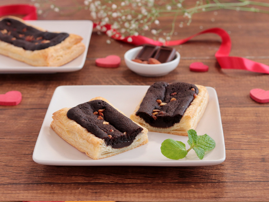パイ生地の上にチョコクリームとブラウニー生地をのせて焼き上げました。