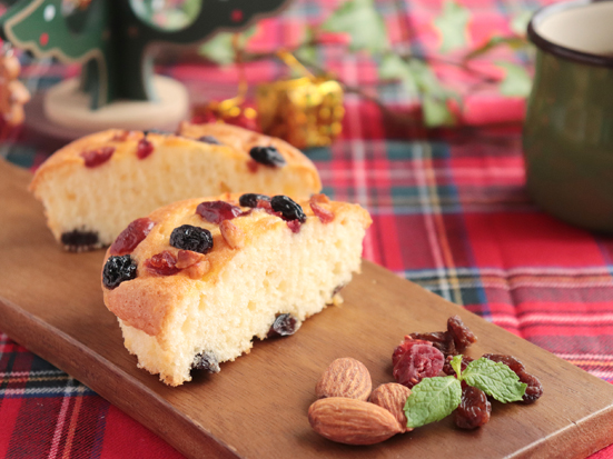 洋酒の風味を効かせた生地にレーズン、オレンジピール、ドライクランベリー、クラッシュアーモンドをトッピングしました。