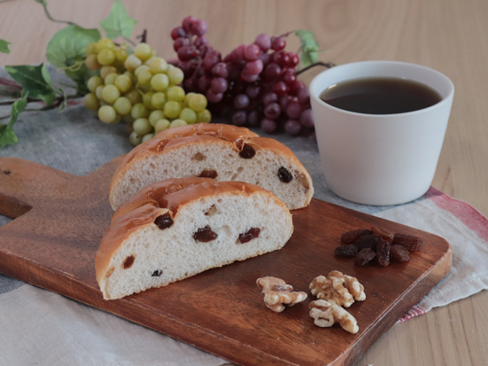 湯捏生地入りのもっちり生地にくるみとレーズンを練り込みました。