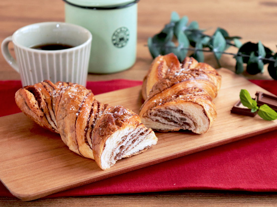 チョコシートを折り込んだデニッシュをツイストし、ザラメを全体にトッピングしました。