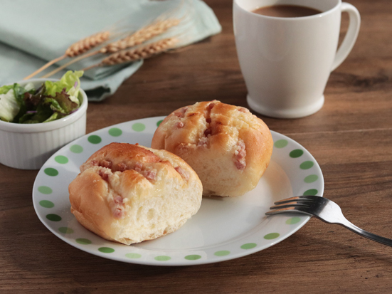 湯捏生地を使用したもちっとした食感の生地にダイスハムとオニオン入りマヨネーズ風味ソースをトッピングしました。