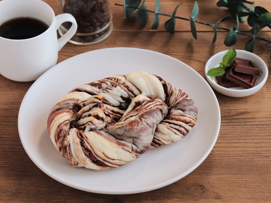 もちっとした白生地にチョコシートを折り込み、ひねりを加えて焼き上げました。