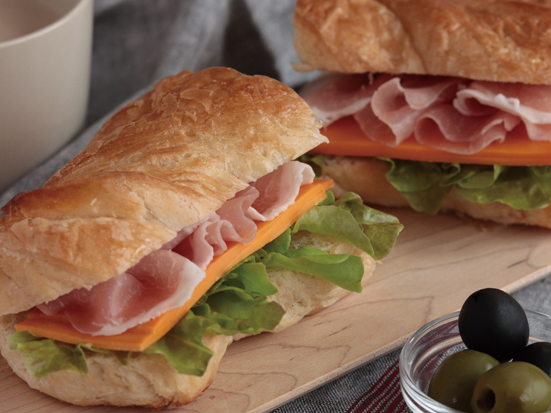 常温においたバターを塗り、サニーレタス、半分にしたミモレットチーズ、軽く折り曲げた生ハムを挟みます。