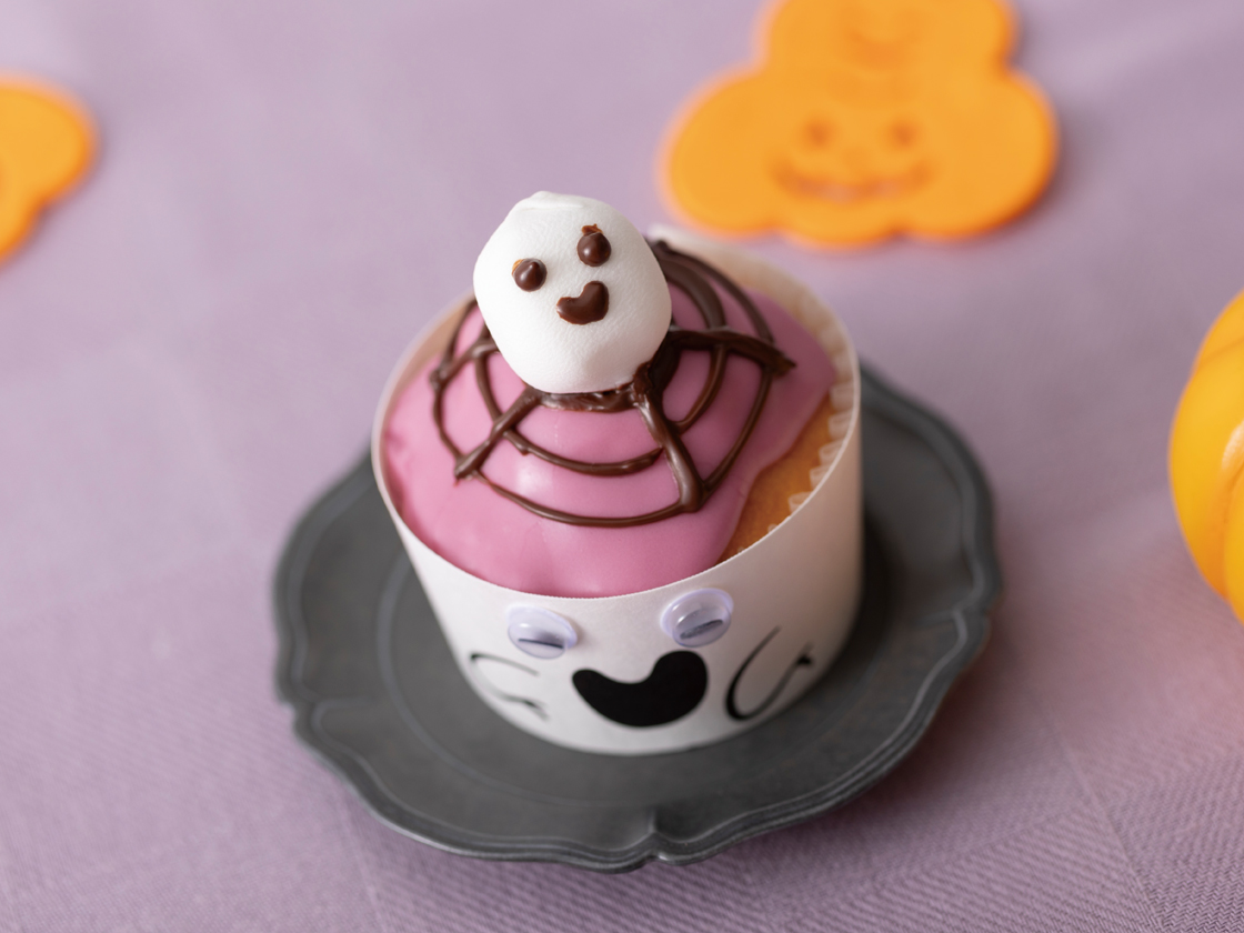 細かく刻んだブラックチョコレートを、耐熱容器に入れ電子レンジで1分加熱し、4の上にクモの巣模様を描きます。小さいマシュマロに顔を描き、マフィンの上にのせます。