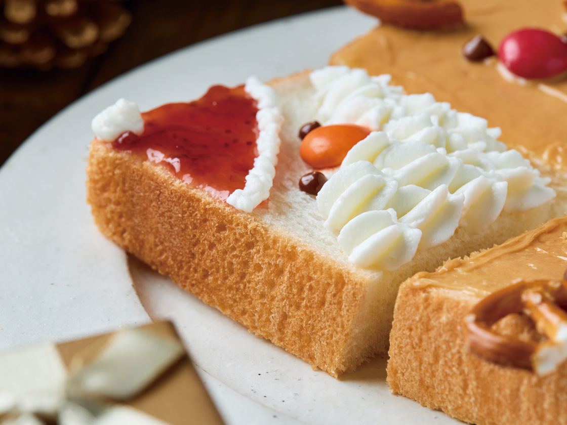 もちふわ食パンを4等分にカットし、対象になっている生地2枚にピーナッツバターを塗ります。
