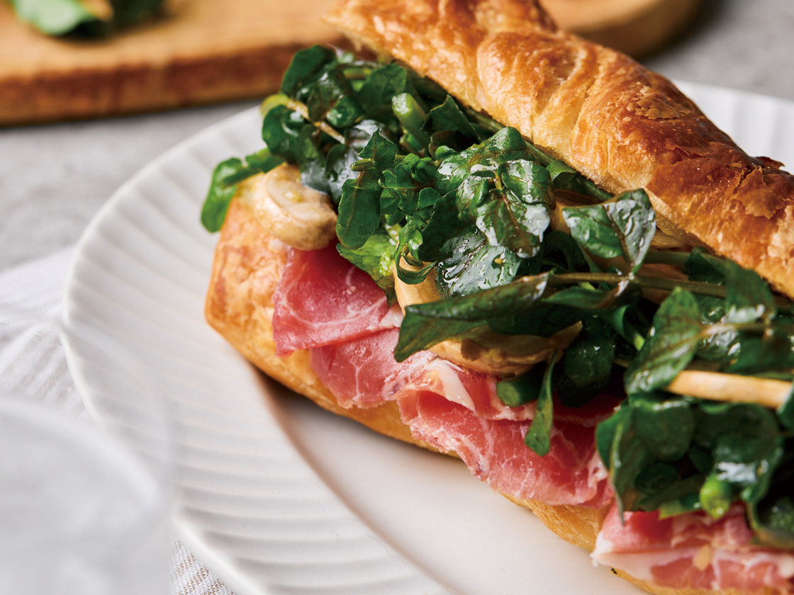 1のバゲットクロワッサンの切り口にバターと粒マスタードを塗り、生ハムを挟み、その上に3をたっぷり挟んで完成です!